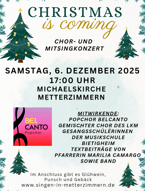 Der Chor und alle Beteiligten freuen sich auf einen tollen Abend mit moderner Pop-Musik, Gastauftritten und unsere Band, Desweiteren besinnliche